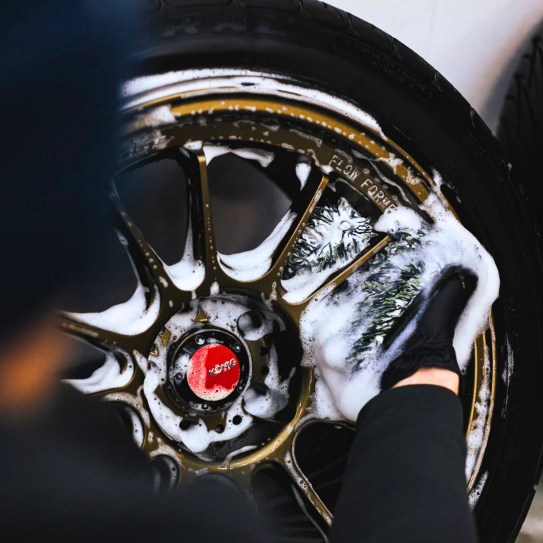 Además, cuenta con un borde de gamuza suave que permite ponerlo y quitarlo con facilidad. La mezcla de microfibra en bucle retorcido ayuda a liberar los contaminantes con mayor facilidad al enjuagar. Además, es resistente a productos químicos, lo que lo hace seguro para usar con tu limpiador de ruedas favorito.