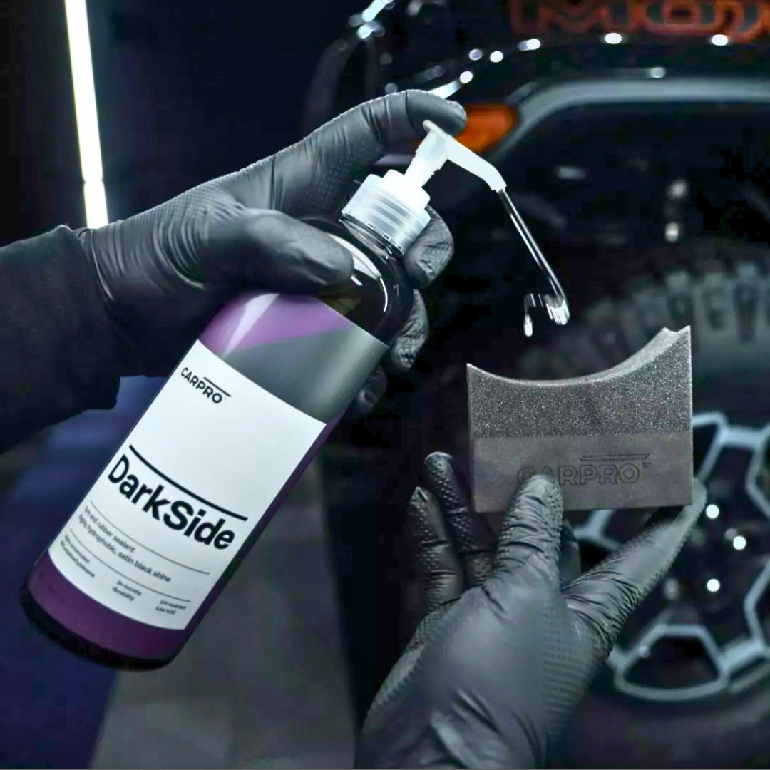 Darkside de Carpro es un sellador diseñado específicamente para plásticos, gomas y neumáticos, gracias a su contenido de polidimetilsiloxano en la formulación. Esto permite una aplicación efectiva utilizando aplicadores como cepillos, almohadillas o microfibras.