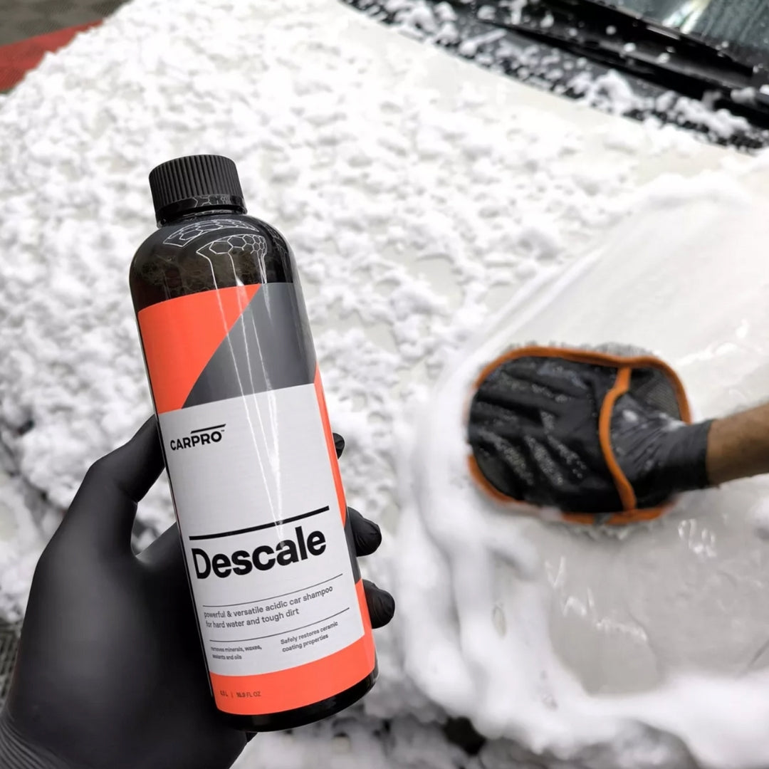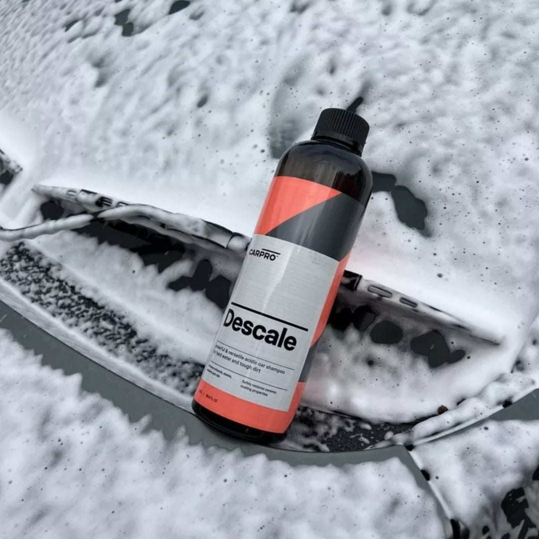 Descale de Carpro es un shampoo pH acido formulado para eliminar ceras y selladores, preparar la pintura para pulido y eliminar minerales de vehículos con recubrimientos cerámicos y no recubiertos durante el mantenimiento de las superficies.Este producto en particular ha sido desarrollado para descomponer de manera efectiva la contaminación acumulada, como sarro, marcas de agua y suciedad incrustada.