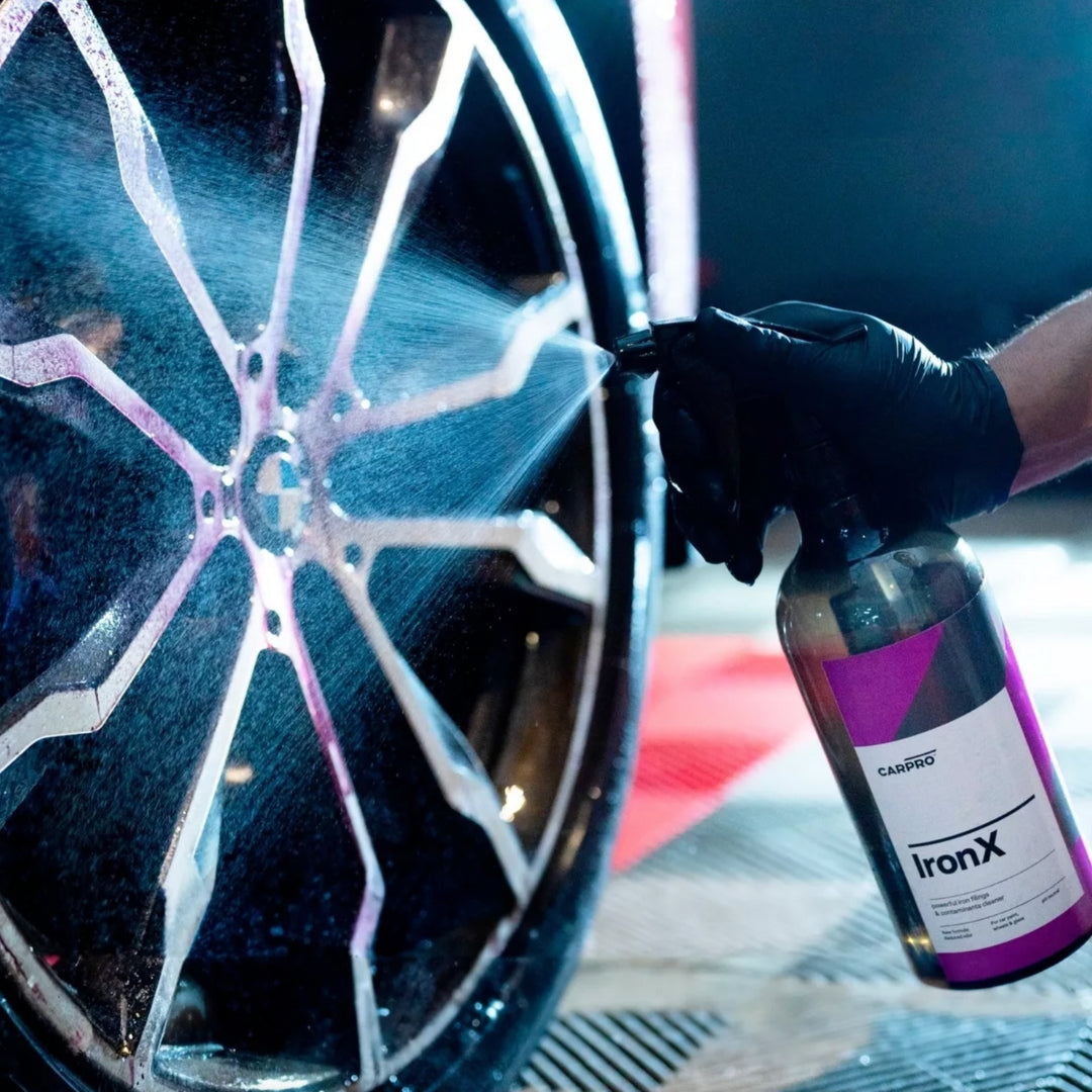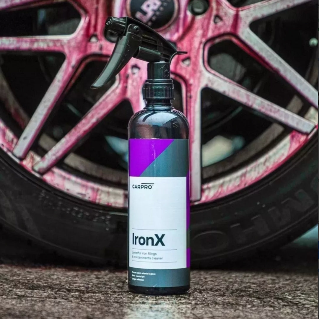 Iron X de Carpro es un descontaminante férrico diseñado para eliminar partículas férricas, especialmente aquellas causadas por el polvo de frenos. Su característica de cambiar a un tono morado al actuar te permite identificar fácilmente las áreas contaminadas.