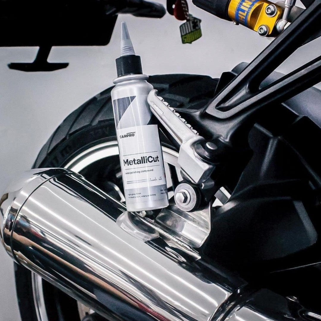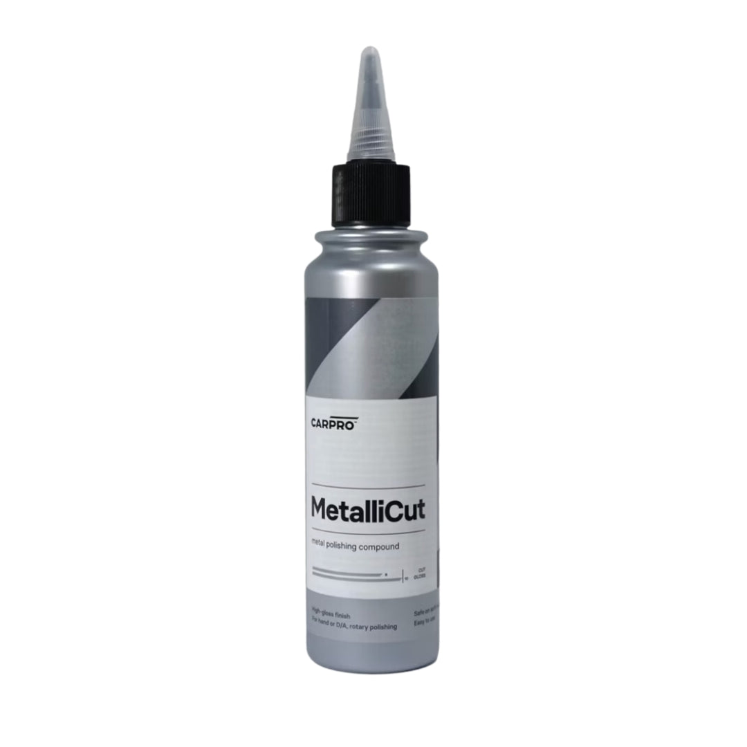 MetalliCut de Carpro está diseñado como un pulimento para metal de corte rápido, proporcionando un acabado con brillo de fábrica. Su fórmula incluye diamantes y abrasivos que optimizan el tiempo de trabajo y garantizan resultados excepcionales. Es perfecto para pulir superficies metálicas como cromo, puntas de escape, ruedas, aluminio, entre otros. Puede aplicarse manualmente, con pulidoras de doble acción (DA) o con pulidoras rotativas.