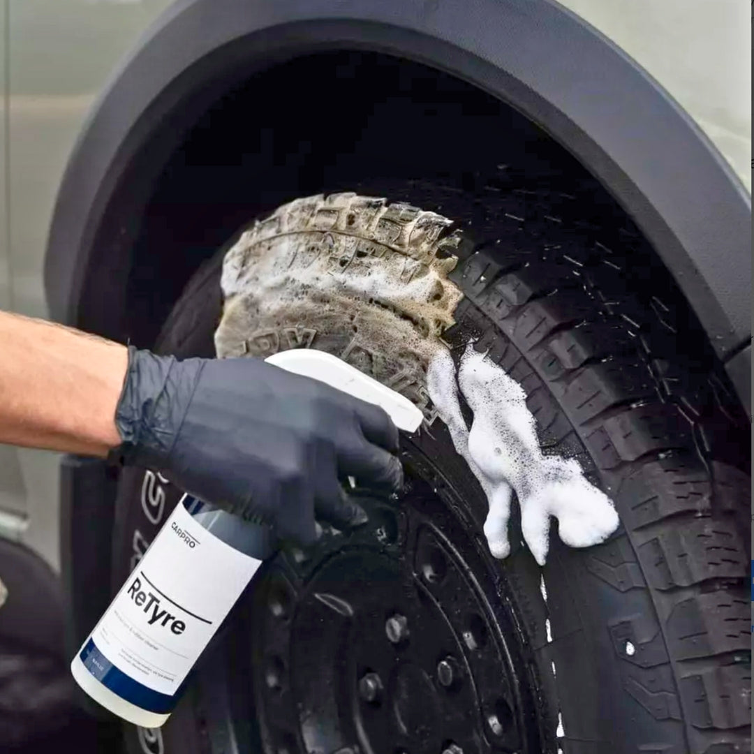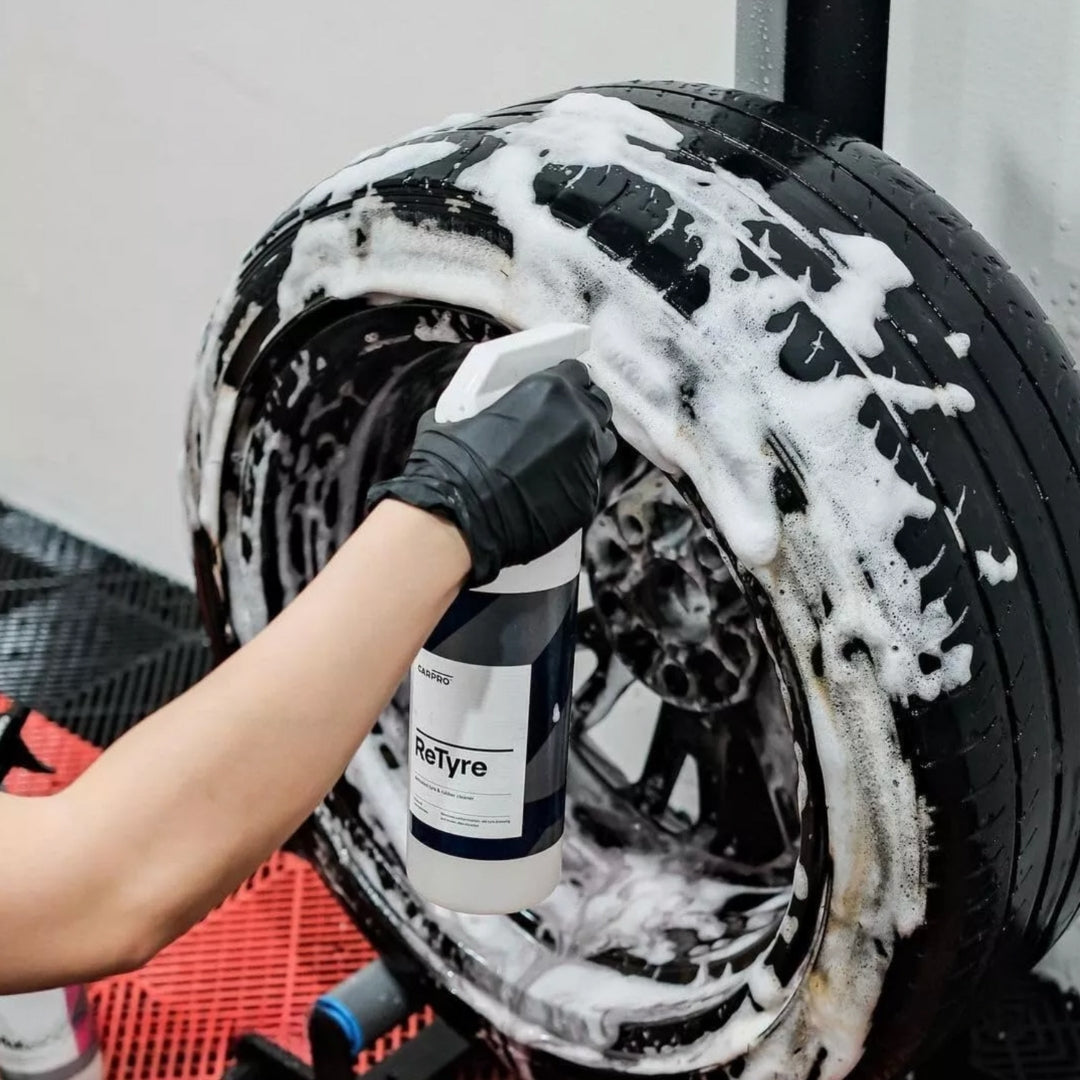 ReTyre de Carpro está diseñado específicamente para eliminar la suciedad acumulada en los neumáticos, así como los dressings y oxidantes que causan ese tono café-dorado, devolviendo su aspecto negro natural.